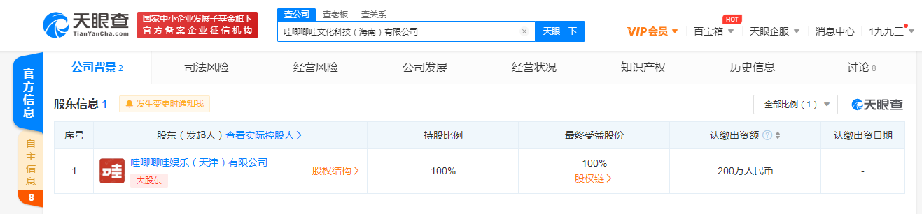 据天眼查APP显示,5月24日,哇唧唧哇文化科技(海南)有限公司成立,法定代表人为黄威,注册资本200万,经营范围包括营业性演出;广播电视节目制作经营;票务代理服务;文化娱乐经纪人服务;动漫游戏开发等。股东信息显示,该公司由哇唧唧哇娱乐(天津)有限公司全资持股。