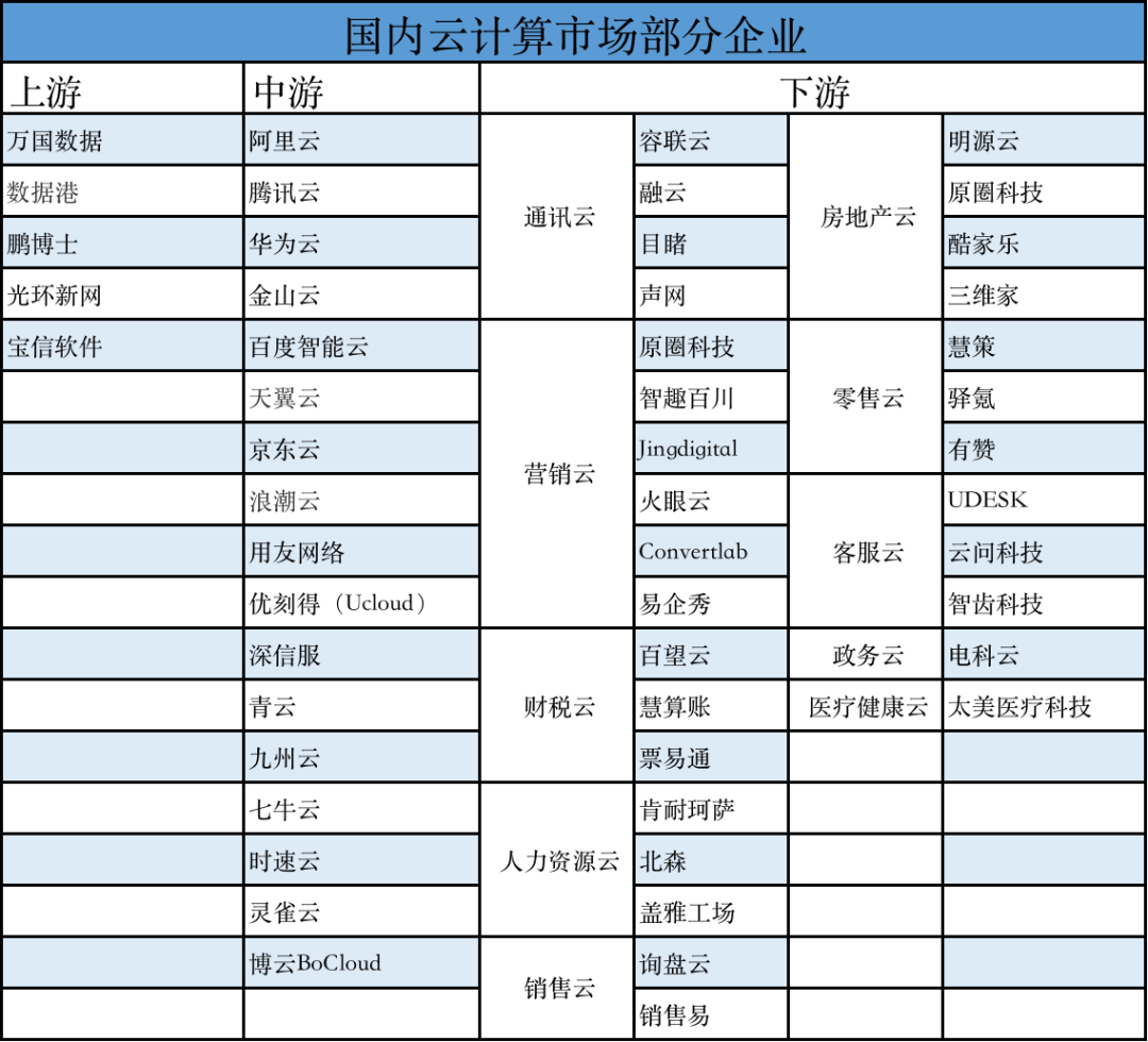 下游主要是软件企业,通讯云、财税云、人力资源云、营销云等,都是云计算的具体应用落地的行业和场景。