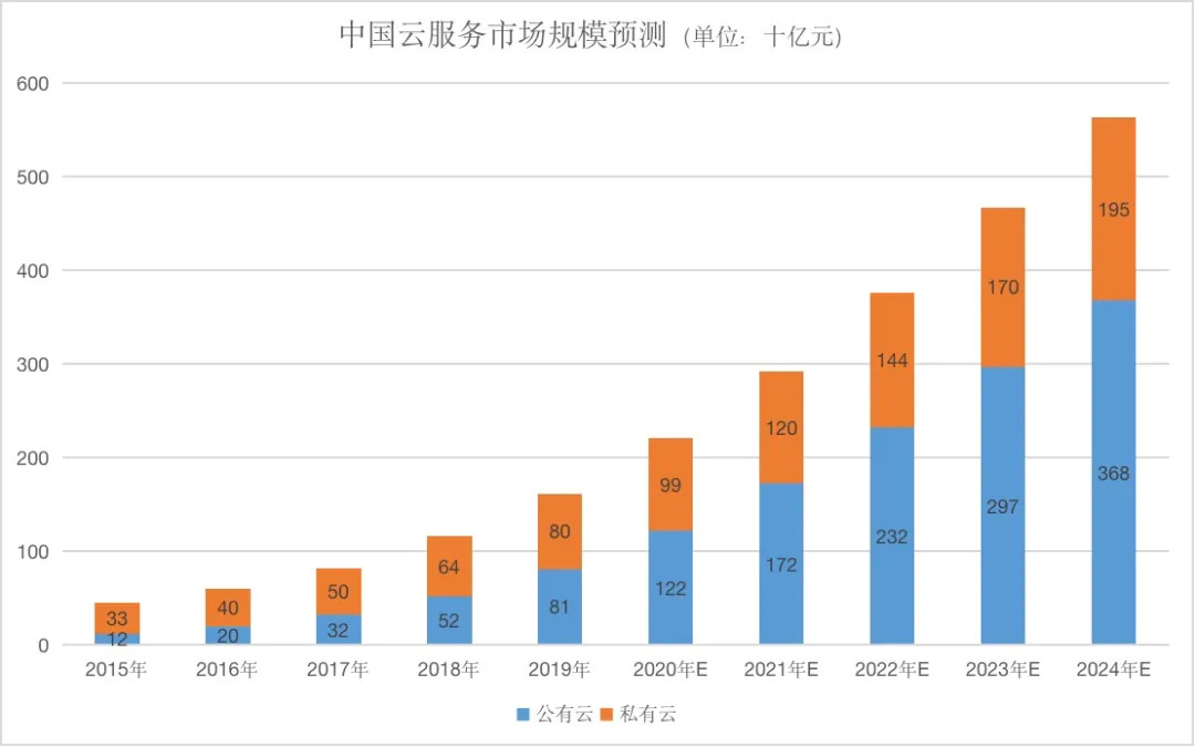 中国信息通信研究院(CAICT)数据显示,从2015年到2018年,中国云服务市场实现38%的复合增速。预期2019年至2024年实现28%的复合增速,预计2024年中国云服务市场规模将达到5600亿元,其中公有云约3700亿元。