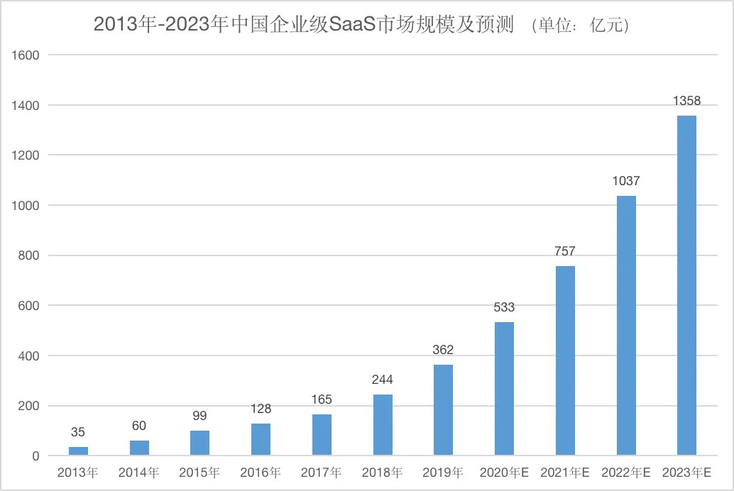 根据艾瑞咨询《2020年中国企业级SaaS行业发展报告》,2019年中国企业级SaaS市场规模相较2018年增长了48.7%。未来,市场仍将保持较快增速,预计2022年中国企业级SaaS市场的规模将突破千亿元。