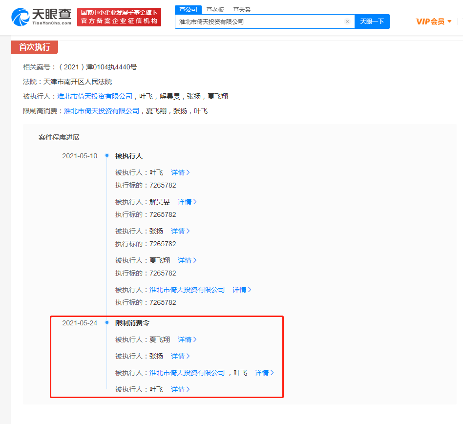 据天眼查APP显示,5月24日,叶飞、淮北市倚天投资有限公司等新增一则限制消费令,相关案号为(2021)津0104执4440号,执行标的7265782元,法院为天津市南开区人民法院。此前,叶飞已多次被限制高消费,淮北市倚天投资有限公司已被列为失信被执行人(老赖)。