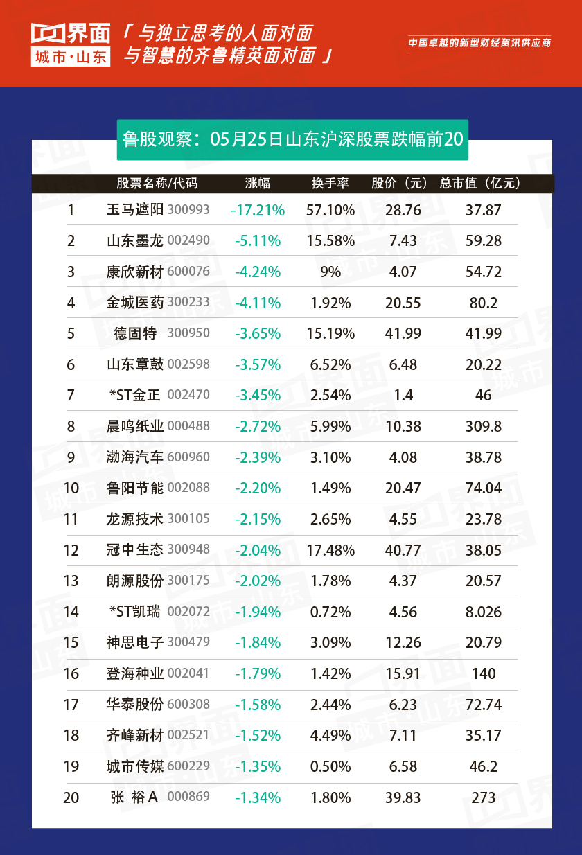 5月25日,山东149股上涨,75股下跌。