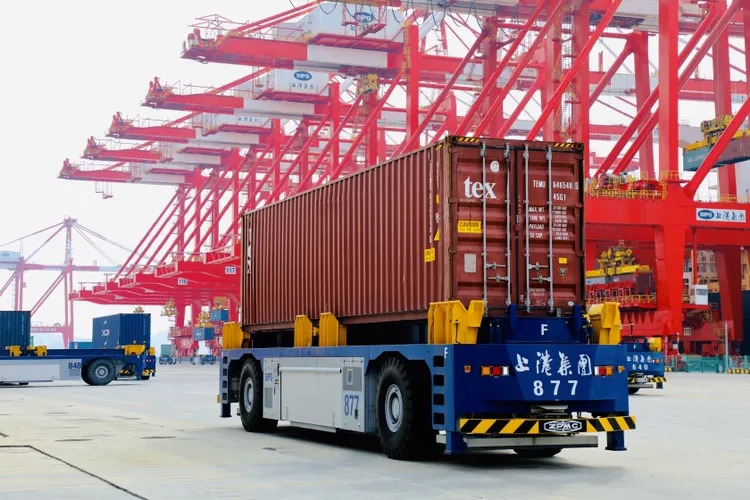 作为中国首个拥有“中国芯”的自动化码头,码头装卸作业采用“远程操控双小车集装箱桥吊+自动轨道吊+自动导引车(AGV)”的生产方案。
