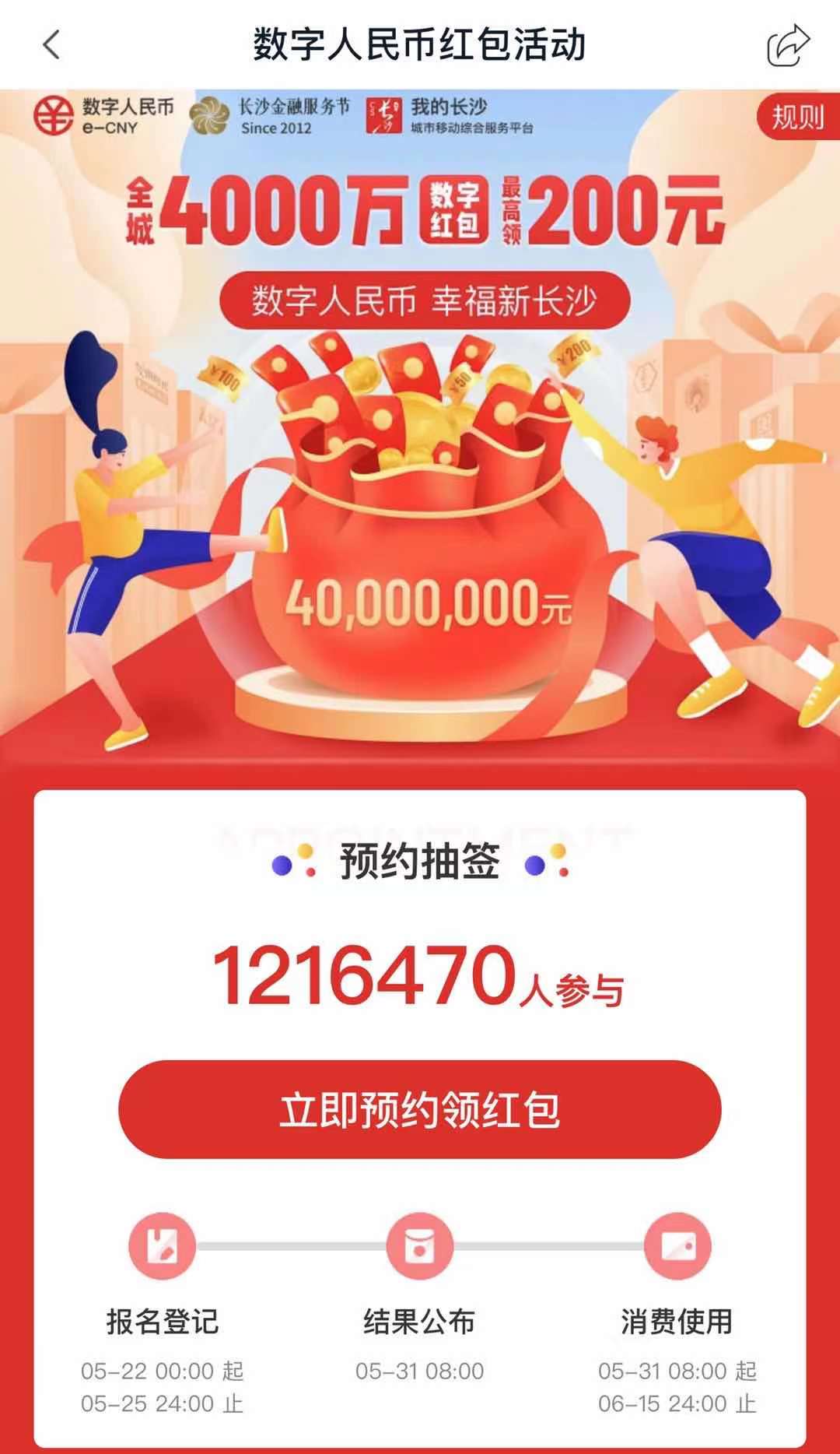 近期,长沙市人民政府宣布,将向广大市民和在长沙个人发放4000万元数字人民币红包(以公开报名和摇号抽签方式进行)。具体方式是:通过“我的长沙”APP进行活动预约申请,活动组织方将从所有预约成功用户中抽取幸运用户30万名,对应发放红包30万个,金额分别是100元和200元两种。预约报名截止时间是5月25日23时59分。