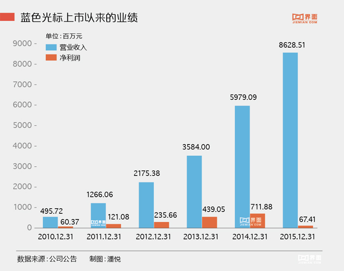 在过去的6年时间里,蓝色光标并购了10家国内公司,7家国际公司,除此之外还投资了40多家公司。疯狂的收购让蓝色光标的收入从2009年3亿翻到2015年的86亿,从一家300人的公司增长到全球6000人的集团。