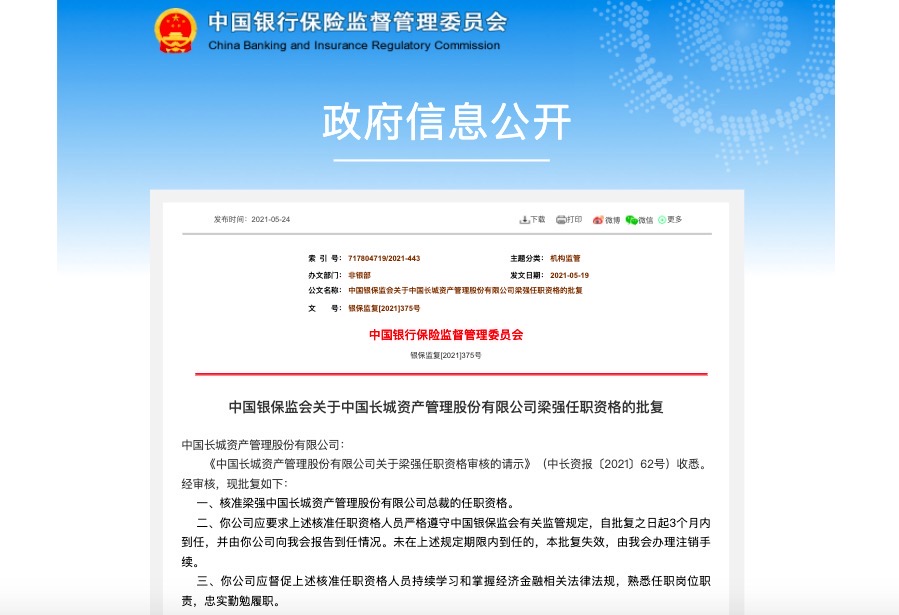 5月25日,银保监会网站公布了关于长城资管梁强任职资格的批复,核准梁强担任该公司总裁的任职资格。