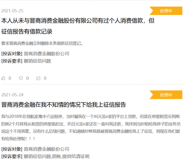 另有消费者表示,其2018年租房时受中介引诱在“元宝e家”平台中贷款。房屋租赁到期前的2个月被赶。“元宝e家”催促还款,房屋中介表示不用偿还,没有后续问题。消费者近期发现,此笔贷款已由晋商消费金融录入了征信系统。