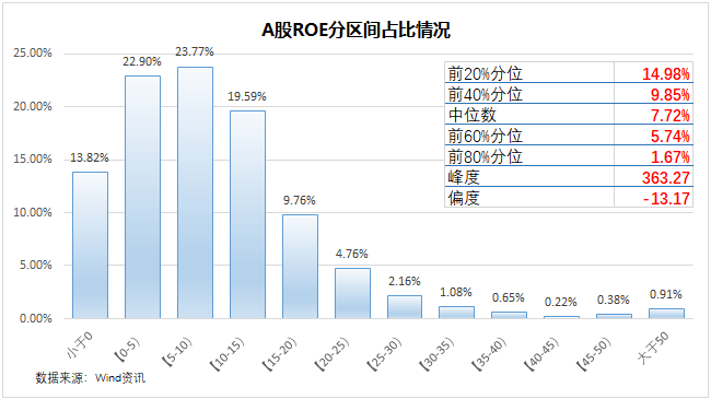 这4161家上市公司ROE的中位数是7.72%,并且主要集中在0-15%这个区间,该区间的上市公司占到全部上市的三分之二左右。