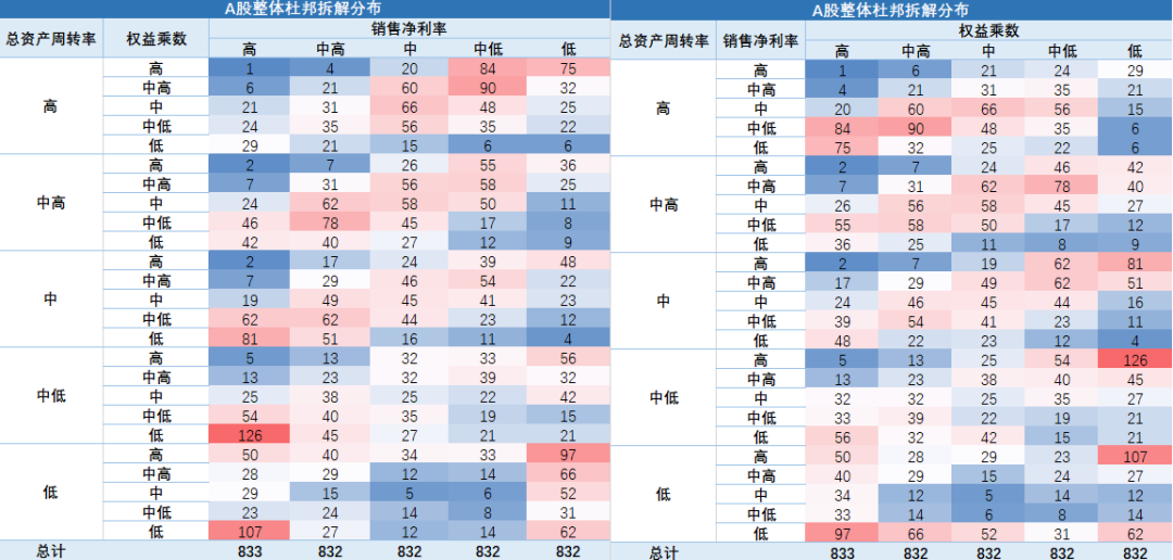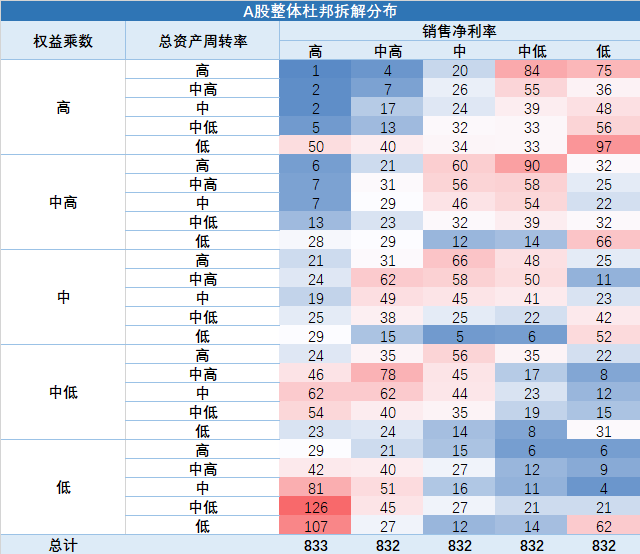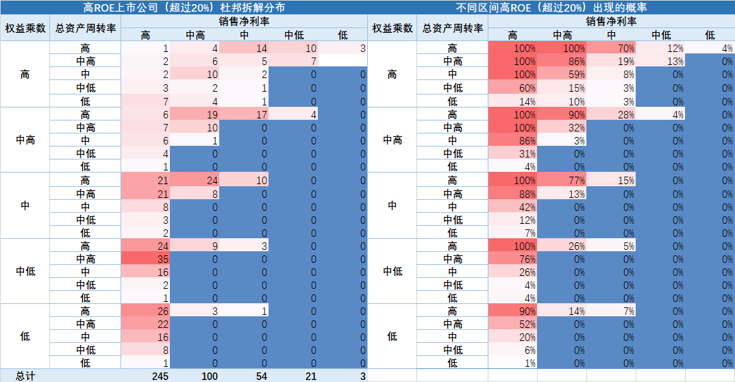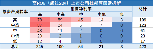 上图是423家ROE超过20%上市公司的杜邦三因素分布,我们可以发现,对于这些高ROE上市公司而言,总资产周转率和销售净利率的分布接近,指标值集中落在了全部A股的高和中高两个区间,而权益乘数在五个区间中的分布很接近,并没有体现出明显的区别。