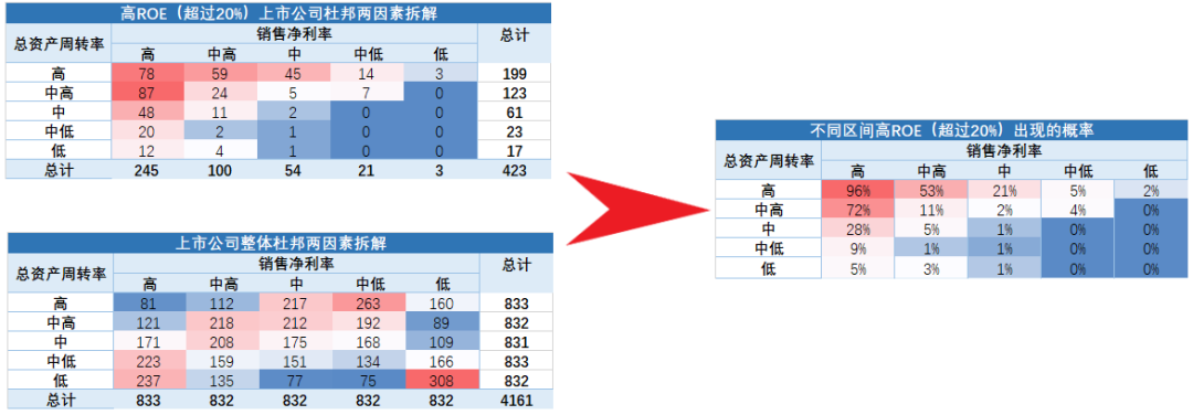 如上图,我们计算出了各个区间,超过20%的ROE出现的概率。可以发现,当一家上市公司总资产周转率销售净利率双高的时候,上市公司ROE超过20%的概率近乎100%,高销售净利率中高总资产周转率的概率次之,72%,高资产周转率中高销售净利率的概率就下来了,只有53%,一半多一点,其他的类型,概率都没有超过三分之一的。