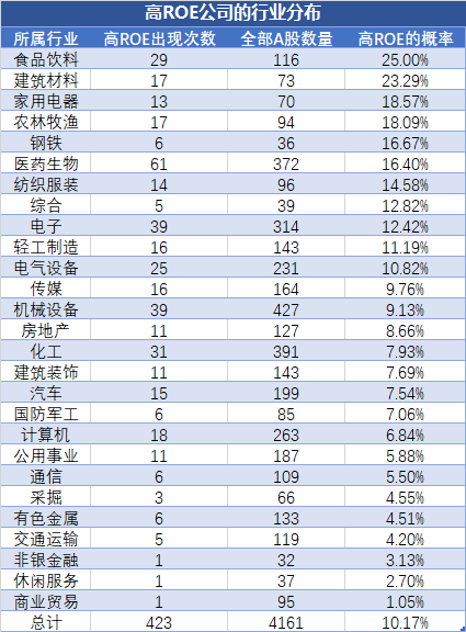 在全部4161家上市公司中,ROE超过20%的优秀公司共有423家,10%的概率多一点。从上面的表格,我们可以发现以下几个行业特征: