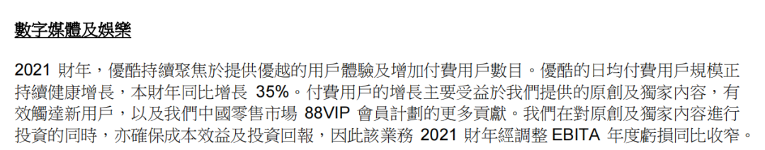 根据阿里财报显示,截至2021 年 3 月 31 日三个月,阿里的数字媒体与娱乐业务的收入8,047百万,较2020年同期增长12%。虽然整个财报中提及优酷的内容并不多,但也重点突出了优酷付费会员同比增长35%这一数字,并点明得益于站内推出的原创、独家内容有效触达了新用户,以及推出的 88VIP 会员计划,和对于内容制作及内容制作能力的严谨投资。