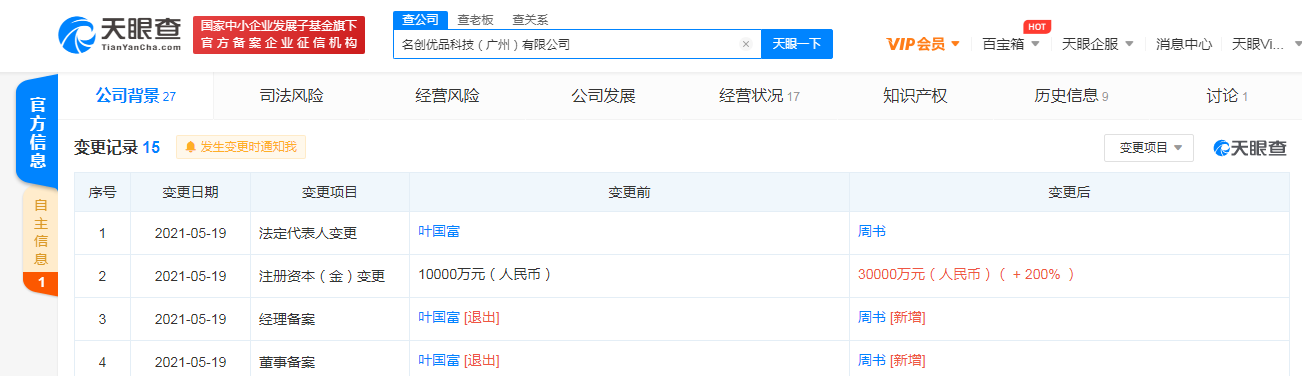 据天眼查APP显示,5月19日,名创优品科技(广州)有限公司发生工商变更,注册资本由1亿人民币增至3亿人民币,增幅200%。同时叶国富退出法定代表人及主要人员,由周书接任。
