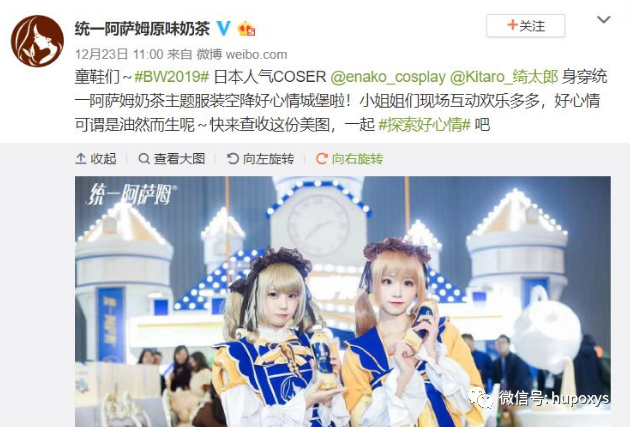 阿萨姆其实不乏创新基因。2019年,在BW2019上,阿萨姆奶茶官方曾专门邀请了enako和绮太郎两位小姐姐,让她们直接cos了阿萨姆奶茶。活动热度并不低,还引发了“我的阿萨姆为什么不能变成美少女”等相关话题的讨论。