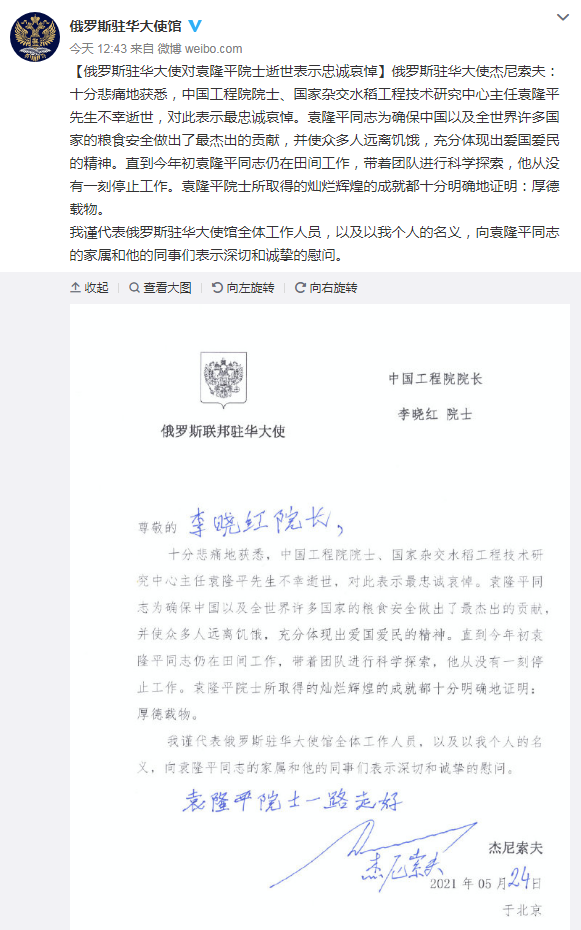 据@俄罗斯驻华大使馆 微博5月26日消息,俄罗斯驻华大使对袁隆平院士逝世表示忠诚哀悼。