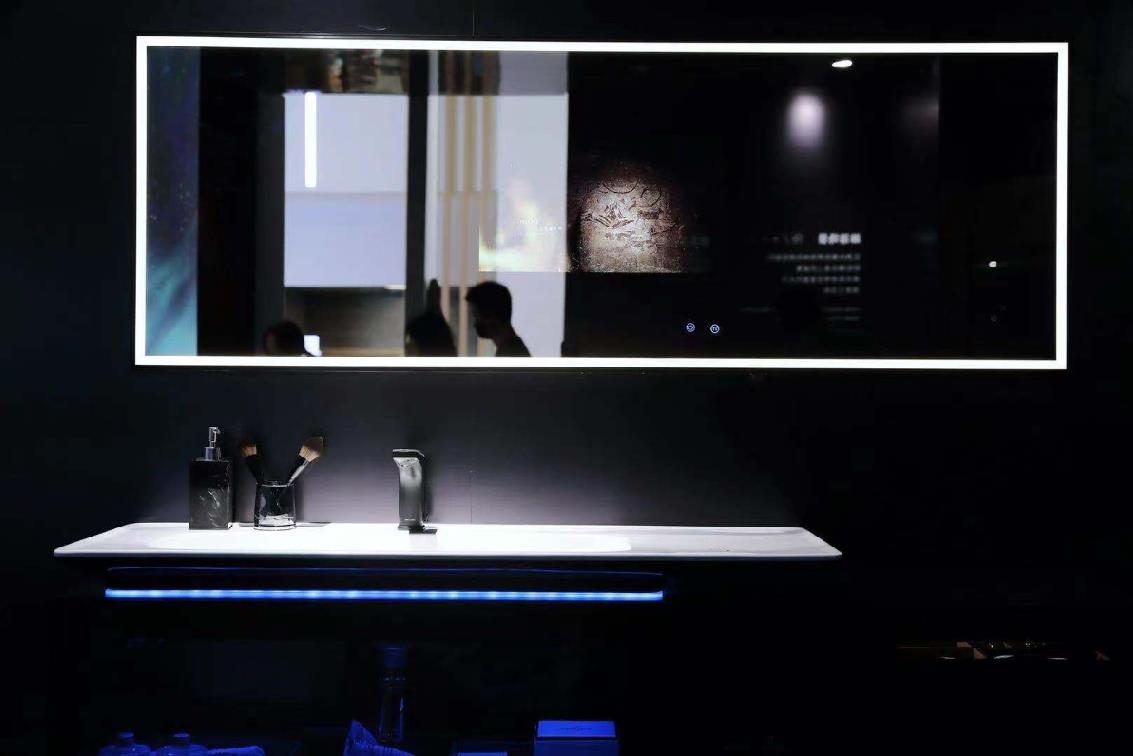 自带抗菌功能的浴室柜,搭配黑白双色无缝拼接亚克力台盆和氛围灯,智慧又时尚。通过智能魔镜,可以一键看新闻、查天气、播视频、控制家里的智能电器,轻松实现整体空间智能设备的物联。浴室柜搭载有灵敏的感应系统,轻轻触摸即可开启抽屉和柜门,面盆龙头感应触控双功能,可以数显精准控温。此外,还特别设置了无线充电功能,方便给手机充电。