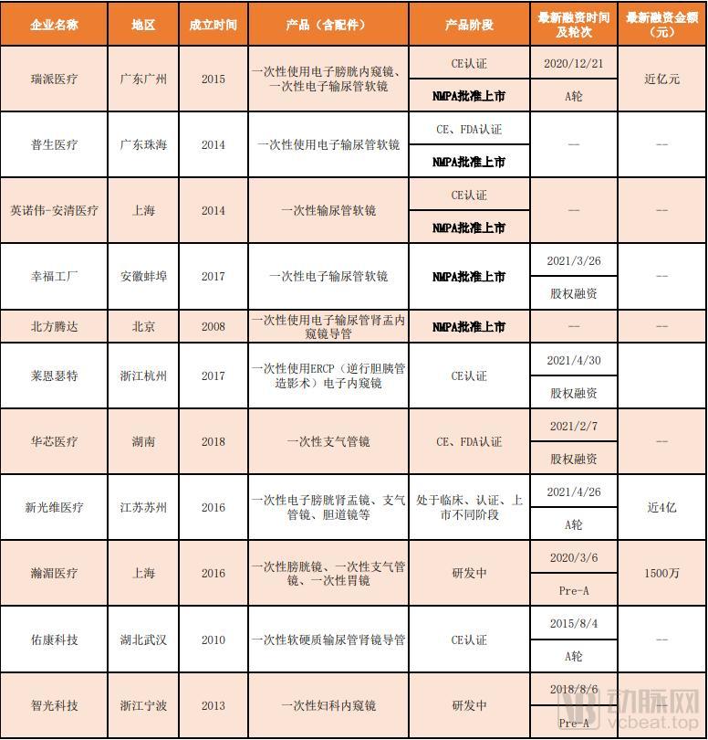目前为止,国内已有5家企业获得了6张国家药品监督管理局(NMPA)注册证,分别是瑞派医疗、普生医疗、英诺伟(子公司-安清医疗)、幸福工厂和北方腾达。其中,瑞派医疗获得两项批准,分别是其一次性电子膀胱内窥镜和一次性电子输尿管软镜。