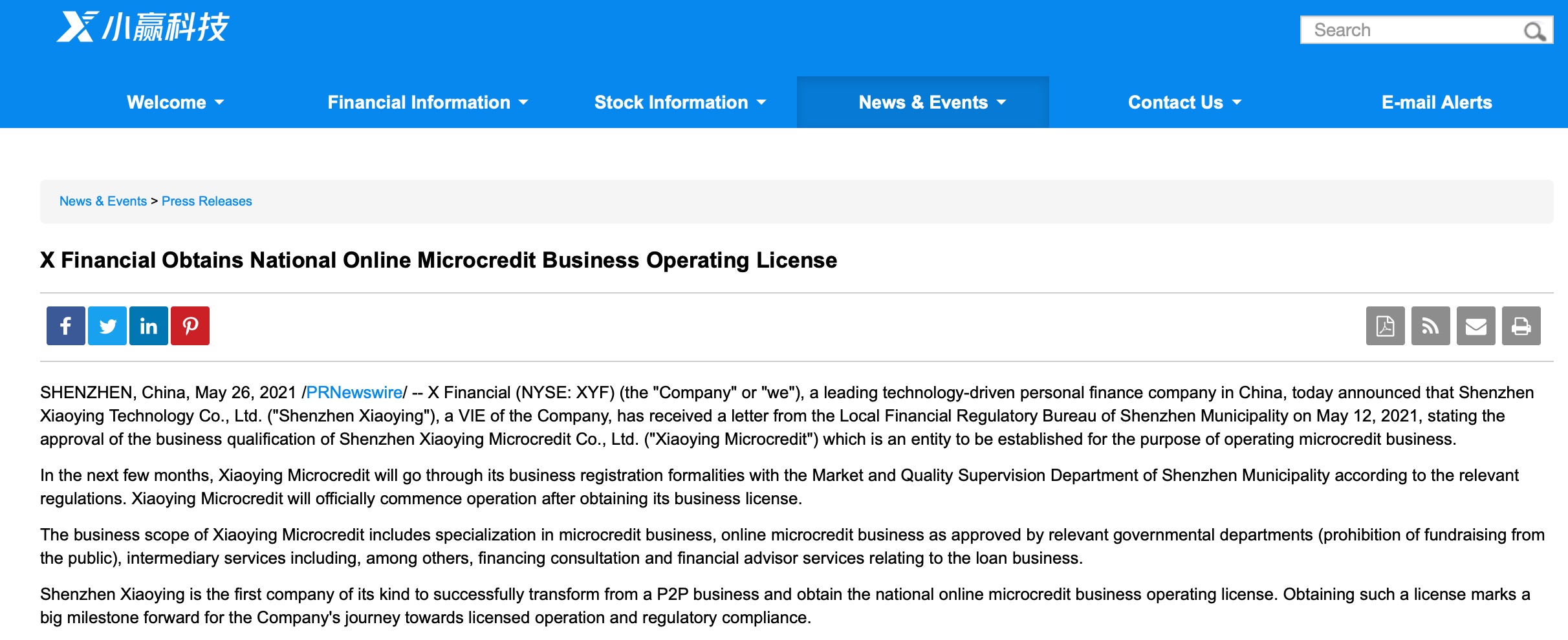 5月26日,美股上市公司小赢科技(XYF.US)发布公告称,公司于5月12日收到深圳市地方金融监督管理局关于批准深圳市小赢小额贷款有限责任公司(以下简称“小赢小贷”)业务资格的函。