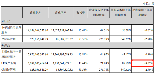 兆驰股份2020年年报显示,LED产业链为毛利率最低的产品,其毛利率仅为11.64%,且相较于上年同期大幅减少8.07个百分点。其中兆驰光元负责的LED封装业务营业收入为23.38亿元,占LED产业链总营收的63.49%。