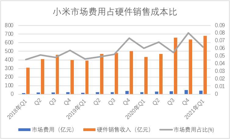 若小米之家达到理想状态,则会提高小米硬件产品的销售效率,优化市场费用,于是我们也整理了近三年来市场费用与小米硬件的占比情况(剔除互联网收入),见下图