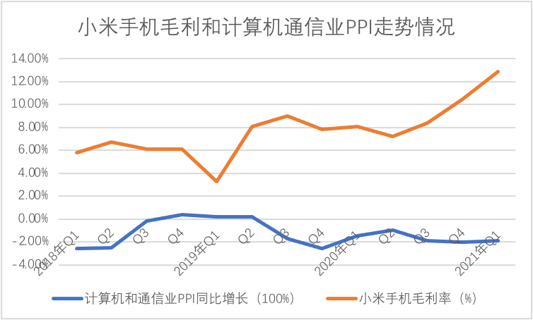 但2020年Q3之后,情况发生了很大变化, PPI仍处于低点,但小米手机毛利率表现却摆脱原有轨道,呈不断上扬的趋势,2021年Q1,手机毛利率达到了12.9%的新高。