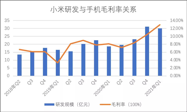 在上图中,可以比较直观看到小米研发规模乃是不断增长的,2020年达到了93亿元的规模大,2021年Q1仍然保持了61%的同比增长,在2020年Q3后,毛利率进入快速改善区间,彼时研发季度支出跨过了20亿元大关。