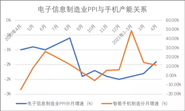 根据工信部数据,我们整理了2020年Q2至2021年4月全国电子信息制造业PPI与智能手机产能的关系,在上述略显杂乱的图表中,我们读到了以下规律:
