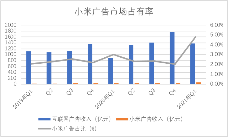 但2021年Q1小米广告市场占比有了相当大的改善,市场占比环比增加两倍,这是本季度财报相当大的亮点,这究竟是趋势性的还是暂时性的呢?