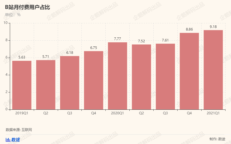 以同为内容社区的B站为例。其2021年Q1财报显示,今年第一季度,B站营收39.01亿元,同比增长68%,营收超出预期,凭借300多亿美元的市值,力压国内老牌视频网站爱奇艺。同时,B站月付费用户达到2050万,付费用户占比达到了9.18%,付费率创下历史新高,这也说明B站用户的付费意愿正在不断提升。