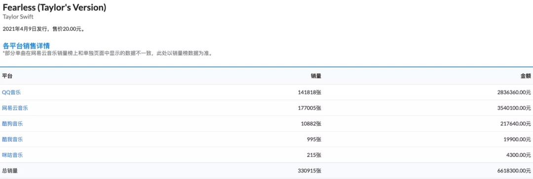 以今年Taylor Swift全新专辑《Fearless (Taylor's Version)》销售为例。作为全网销售的数字专辑,这张专辑在网易云音乐上成绩亮眼,截至5月26日销量超17万张,位居全网第一,超过中国其他平台销量总和,证明了平台用户的高付费意识和消费能力。
