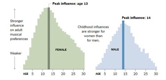 据纽约时报作者Seth Stephens-Davidowitz调查发现,无论男女,平均14岁听的歌将形成一生的音乐品味,进入成年甚至中年后,人们做出的选择也只是强化了或降低了少年时期曾对音乐形成的一些认知。