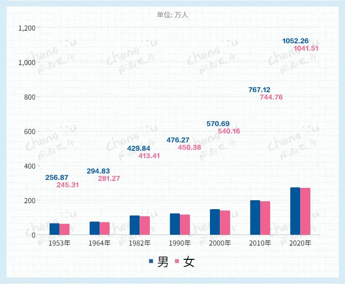 成都常住人口中,男性人口为10522641人,占50.26%;女性人口为10415116人,占49.74%。人口性别比(以女性为100,男性对女性的比例)由2010年第六次全国人口普查的103.00下降为101.03。
