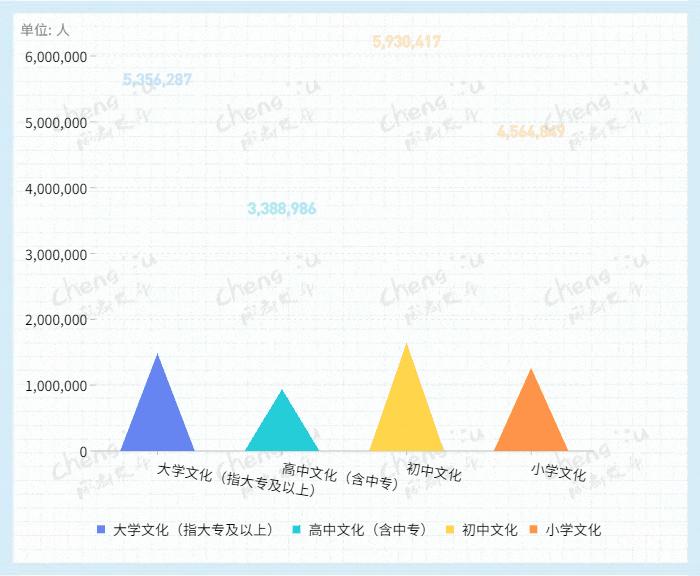 成都常住人口中,拥有大学(指大专及以上)文化程度的人口为5356287人。与2010年第六次全国人口普查相比,每10万人中拥有大学文化程度的由15710人增加到25582人。