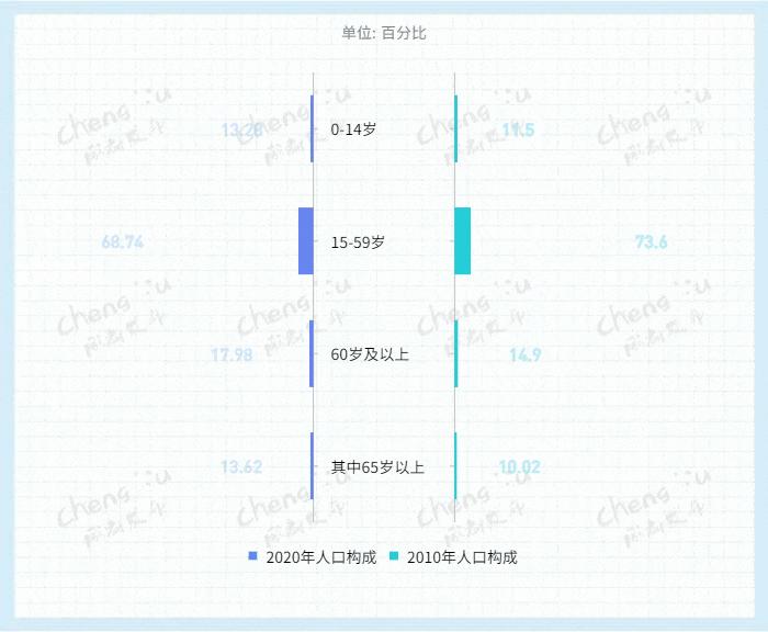 全市常住人口中,0-14岁占13.28%,15-59岁人口占68.74%,60岁及以上人口占17.98%;其中65岁及以上人口占13.62%。
