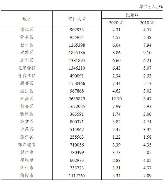 按行政区划,全市20个区(市)县中,常住人口超过100万人的区(市)县有8个,常住人口居前五位的区(市)县依次是:双流区、武侯区、郫都区、新都区、成华区,合计占全市常住人口比重为43.59%。