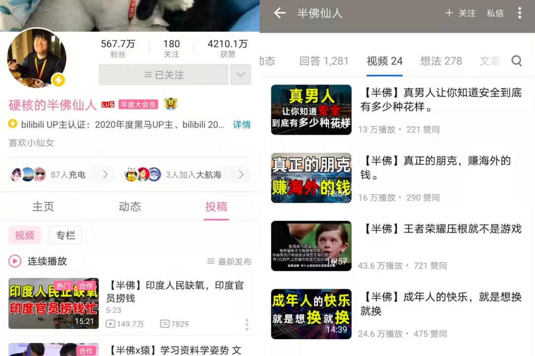 而知乎的视频化战略转变,可能与一个男人有关——“半佛仙人”。半佛是在知乎成长起来的大V,目前在知乎的粉丝达到了160万。但对于知乎失之东隅的是,半佛出圈和商业化的主阵地,却都是在B站。