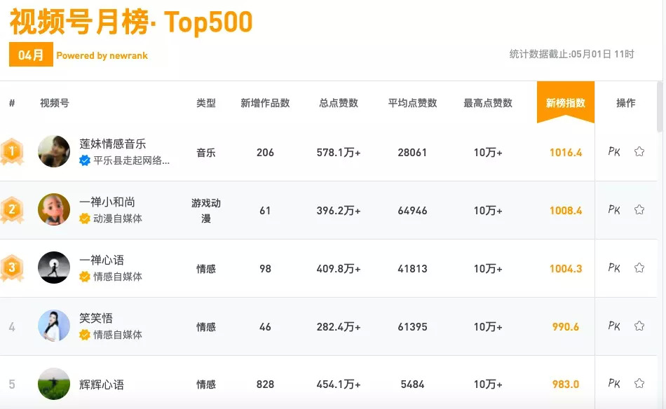 抖音头部虚拟偶像创始人王强告诉Tech星球:“在视频号,他们参与程度很弱,基本是视频同步。因为微信平台头部的视频号也基本没什么合作商单。”这从新榜的视频号月榜中也可以看出,“莲妹情感音乐”和“一禅小和尚”属于头部大号(视频号不显示粉丝数,只有点赞数),但是内容基本没有商业化的痕迹。