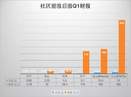 知乎用B站38%的月活,只做到了B站20%的营收;微博则用略多快手的月活,仅实现了快手的17%营收;今年4月份流出的一份访谈纪要则显示,抖音Q1营收为400亿元(广告310亿+秀场90亿元),微信仅计算核心的社交广告收入为185亿元。