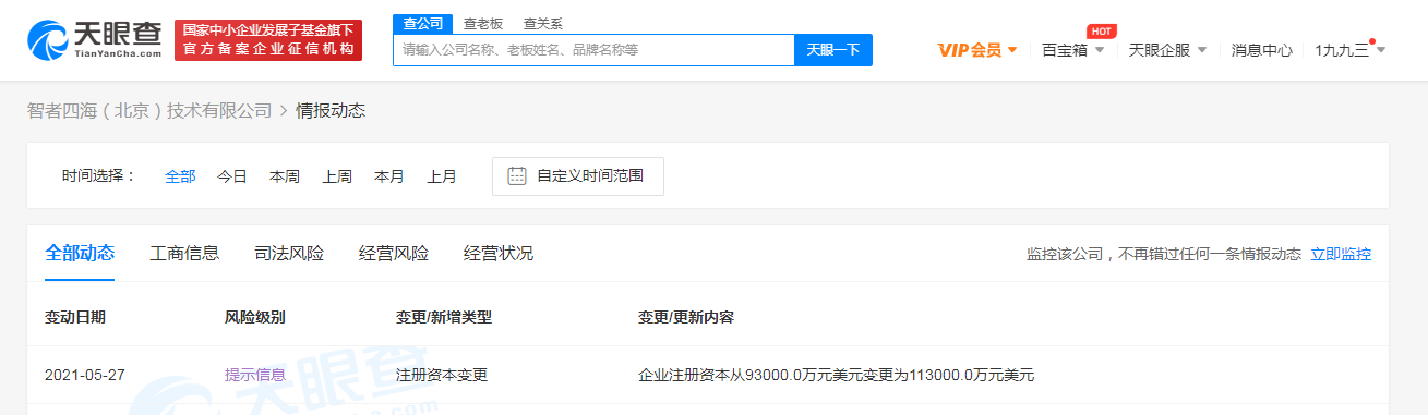 据天眼查APP显示,近日,知乎关联公司智者四海(北京)技术有限公司发生工商变更,注册资本从9.3亿美元增至11.3亿美元,增幅约21.5%。