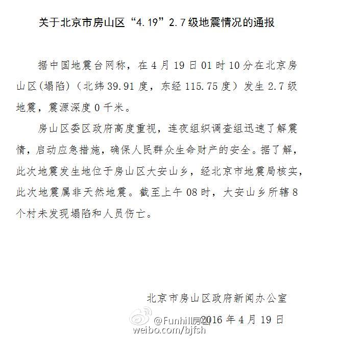 北京市房山区政府官方微博@Funhill房山19日早间发布消息称:经北京市地震局核实,此次地震属于非天然地震,截至上午8时,大安山乡未发现塌陷和人员伤亡。