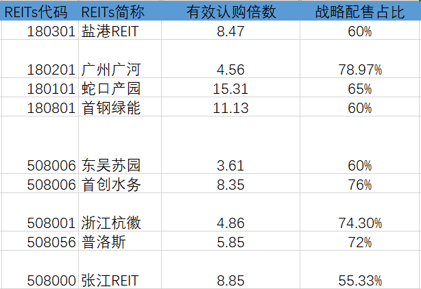 数据显示,张江REIT、浙江杭徽、东吴苏园、普洛斯、盐港REIT、首创水务、平安广河、首钢绿能、蛇口产园的网下有效报价认购倍数分别为8.85倍、4.86倍、3.61倍、5.85倍、8.47倍、8.35倍、4.56倍、11.13、15.31倍。