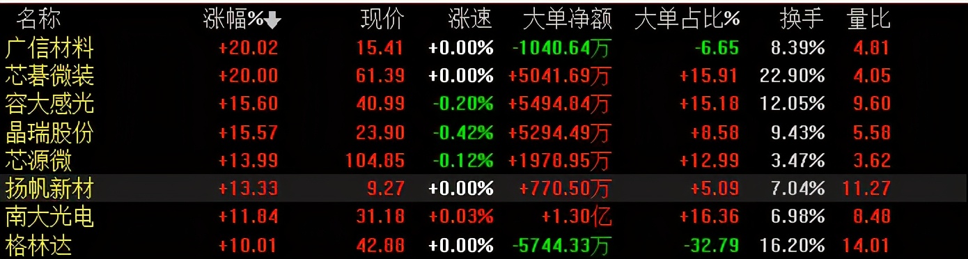 截至发稿,盘面涨幅超过10%的光刻胶概念股有8只,其中广信材料(300537)、芯碁微装(688630)、格林达(603931)涨停。