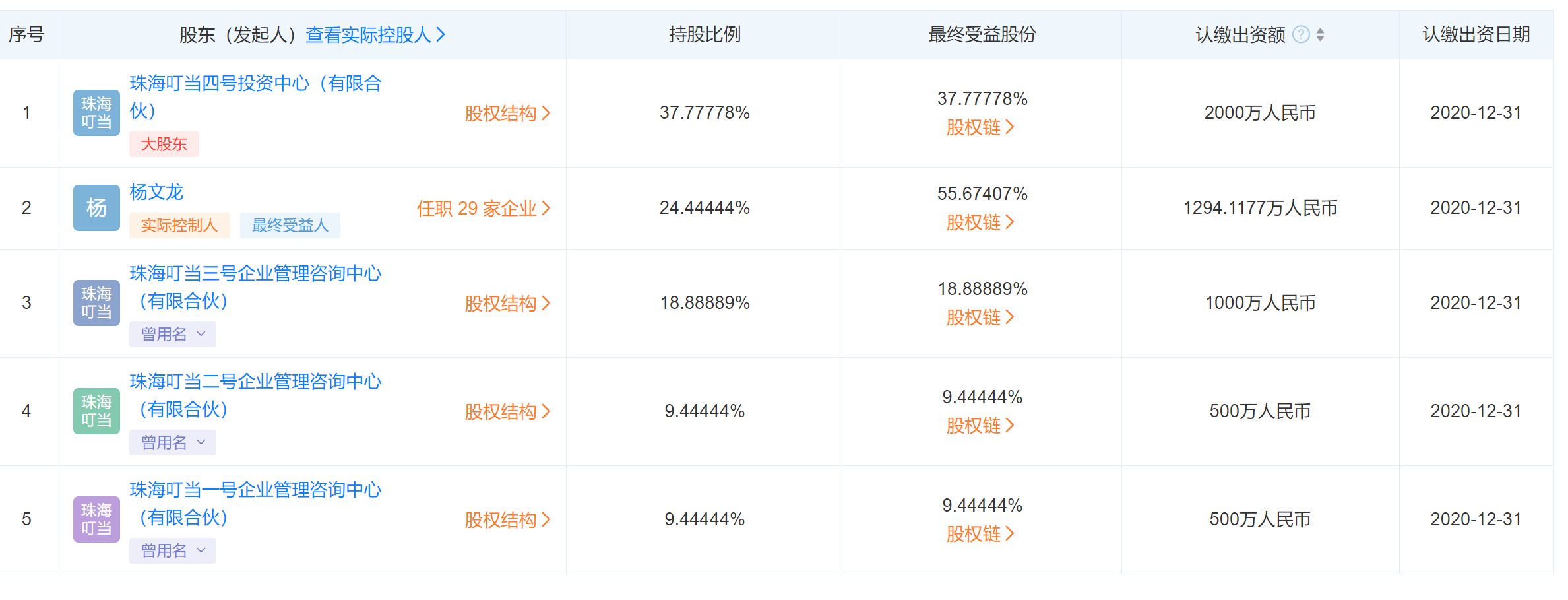 天眼查APP显示,目前叮当快药科技集团有限公司的股东有5位,按持股比例分别为:珠海叮当四号投资中心、杨文龙、珠海叮当三号企业管理咨询中心、珠海叮当一号企业管理咨询中心、珠海叮当二号企业管理咨询中心。而公司主要人员则显示为:徐宁、孟繁周、杨益斌。