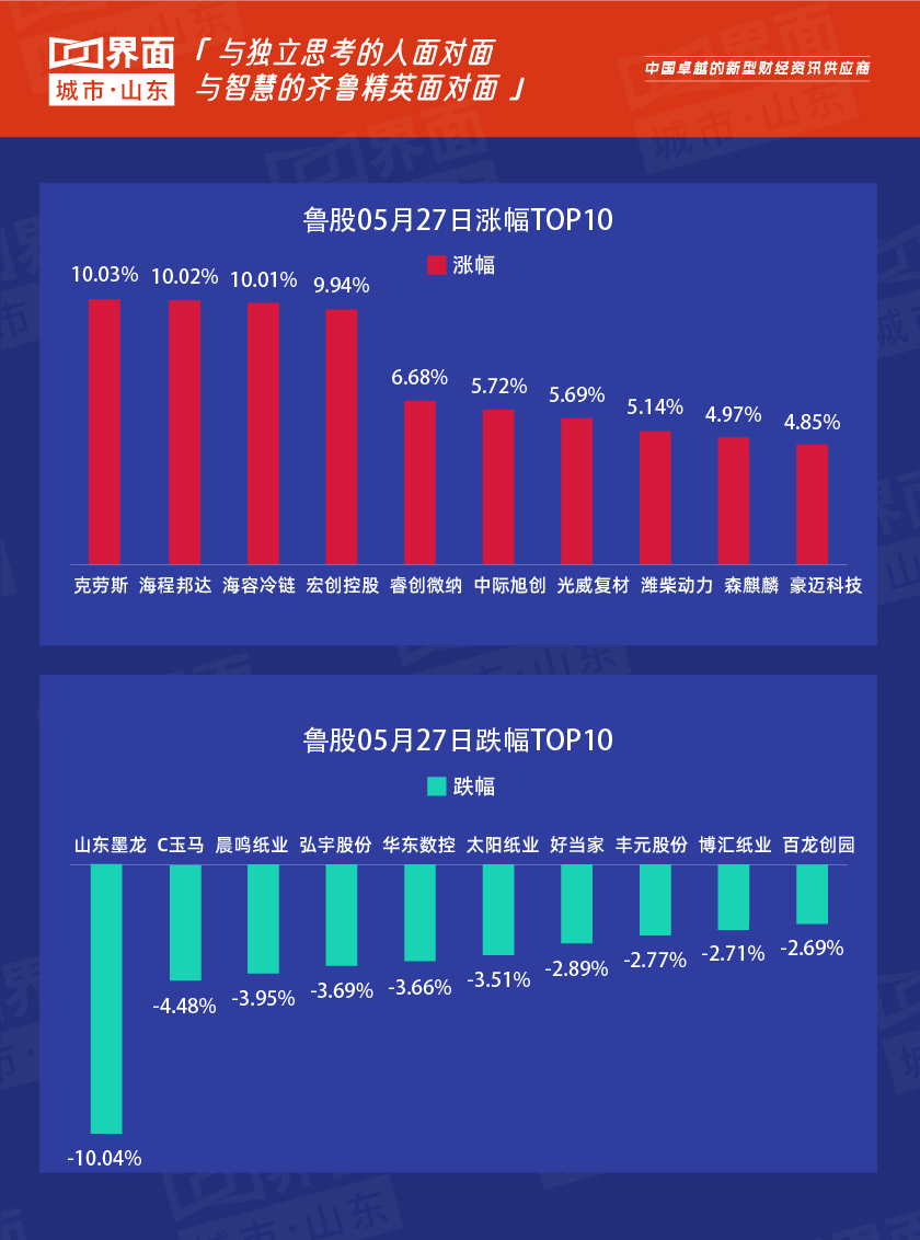 A股三大指数今日集体收涨,沪指上涨0.43%,收报3608.85点,收复3600点整数关口,日K线强势四连阳;深证成指上涨0.70%,收报14897.19点;创业板指上涨0.92%,收报3226.11点。两市合计成交9397亿元,行业板块多数收涨,光刻胶板块爆发。北向资金今日净买入146.27亿元。受大盘影响,5月27日,山东139只股上涨,85只股下跌,13只股持平。