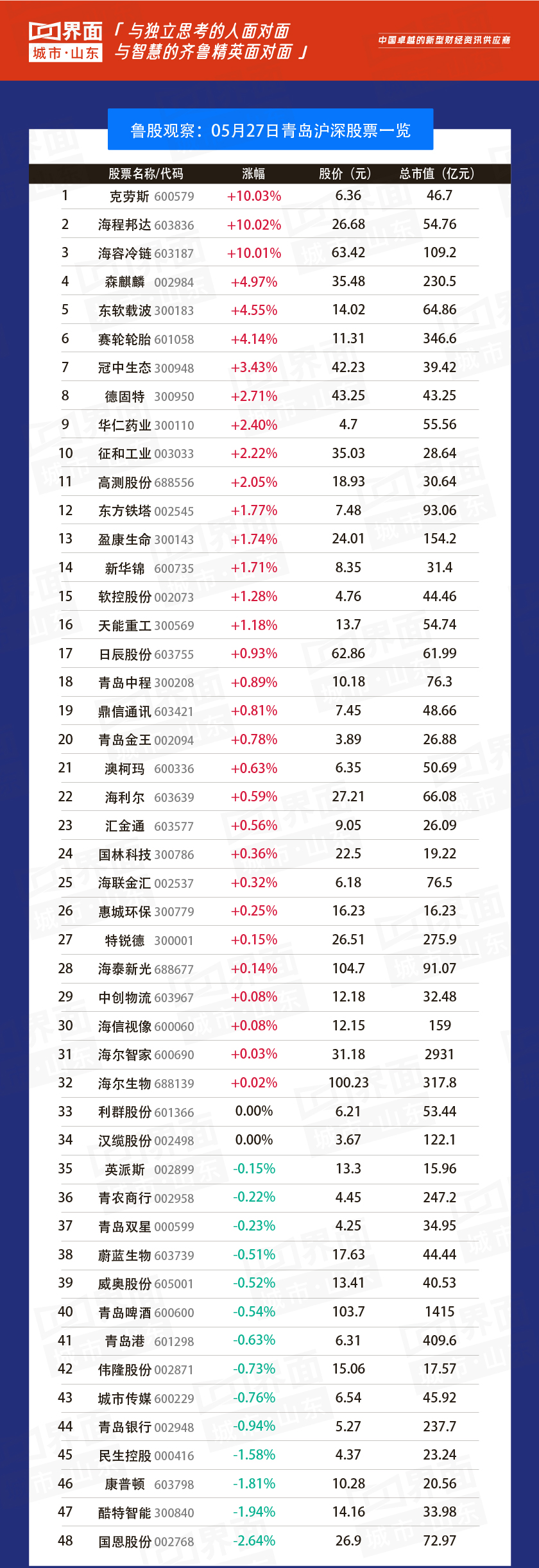 青岛市涨幅榜首:克劳斯(300208),涨幅10.03%,股价6.36元,总市值46.7亿元;