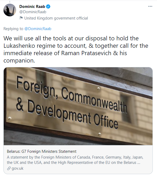 彭博5月27日报道,英国外交大臣多米尼克·拉布(Dominic Raab)在推特上表示,“我们将使用一切可用手段,来追究卢卡申科政府的责任”。