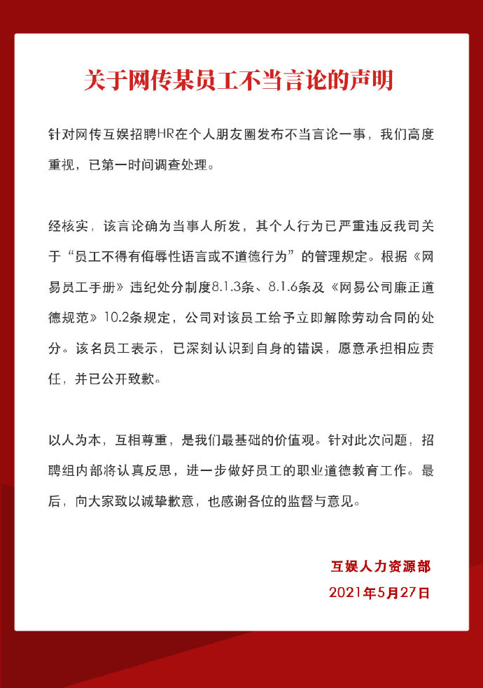 @网易招聘 5月27日晚在微博上发布网易互娱人力资源部的声明称,“针对网传互娱招聘HR在个人朋友圈发布不当言论一事,我们高度重视,已第一时间调查处理。”