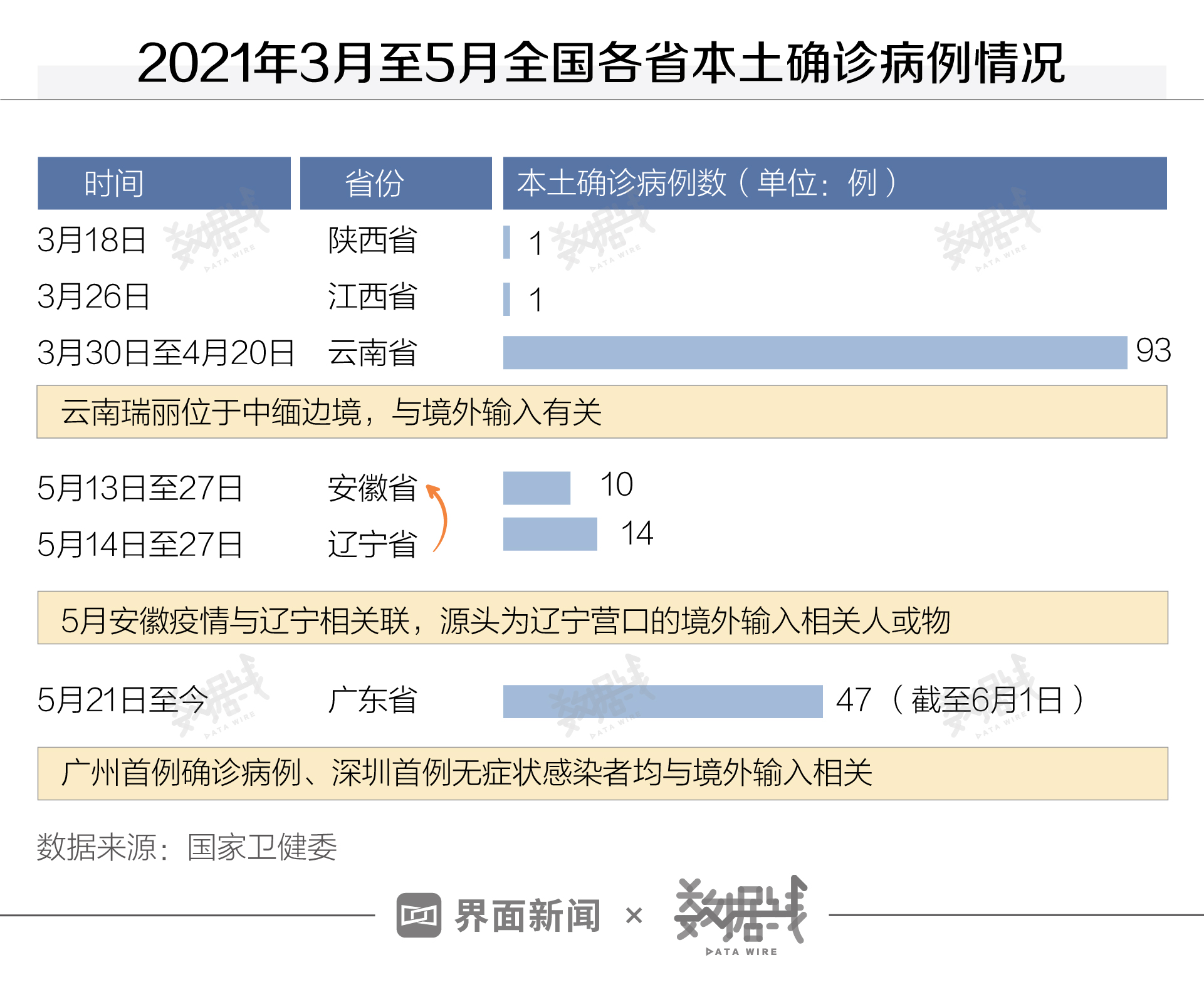 今年3月以来,国内先后有6省发现本土确诊病例,分别为陕西、江西、云南、安徽、辽宁和广东。截至目前,除广东外,各地新增病例都已清零。5月13日,安徽六安市确诊1例本土新冠病例,为安徽省220天以来首例本土病例。中疾控流行病学首席专家吴尊友判断,辽宁省营口或为此次本土病例源头,与境外输入的人或物相关。经由流调、全员核酸检测、封闭式管理等一系列防控措施,目前安徽、辽宁两省已无新增本土病例。截至5月31日,辽宁省中风险地区全部清零,安徽省中风险地区由7个降至1个。