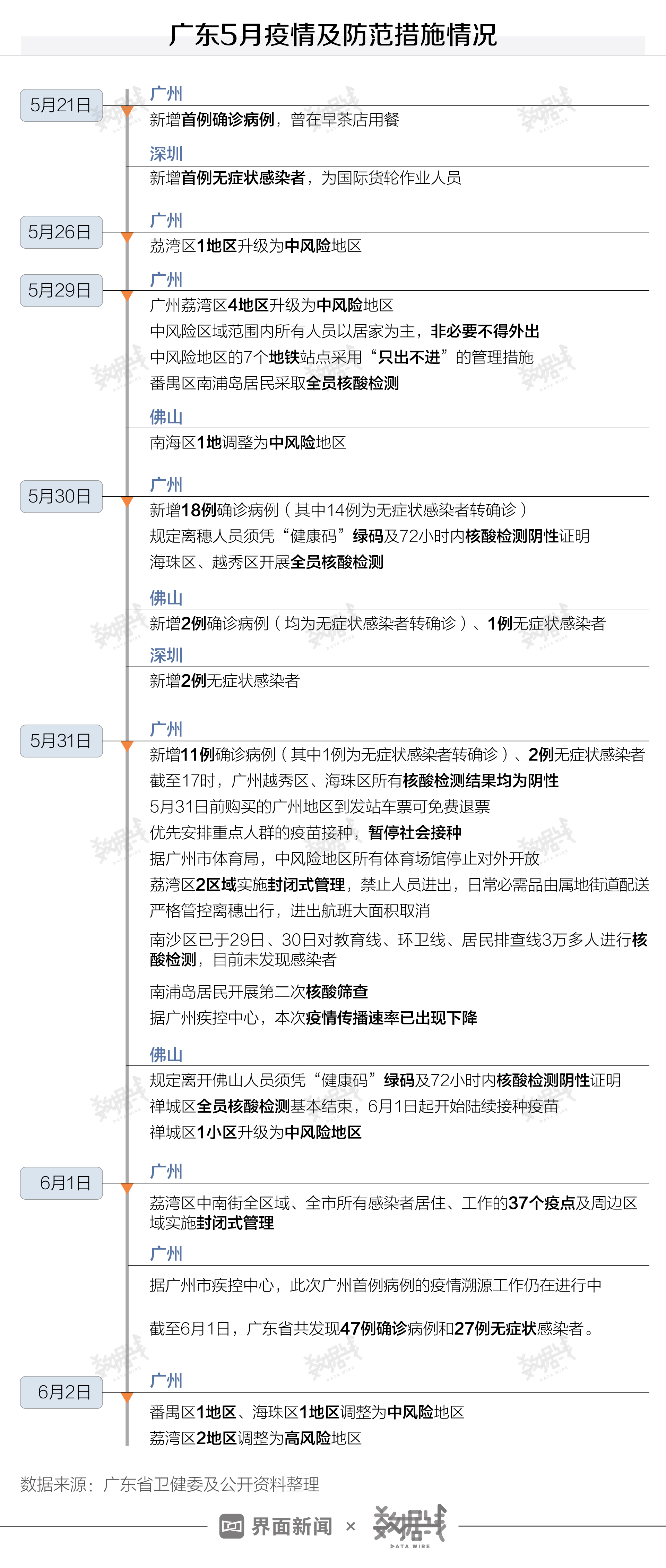 截至5月31日,广东省6地区调整为中风险地区。广州、佛山先后规定离开两地的人员须凭72小时内核酸检测阴性证明及“健康码”绿码。截至6月1日12时,广州市累计监测核酸347万份,其中第二轮检测样本179万份,已发现16例阳性。