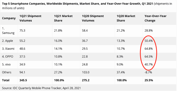 Canalys数据显示,2021年一季度国内智能手机出货量,vivo和OPPO以市占率23%和22%位列前二。